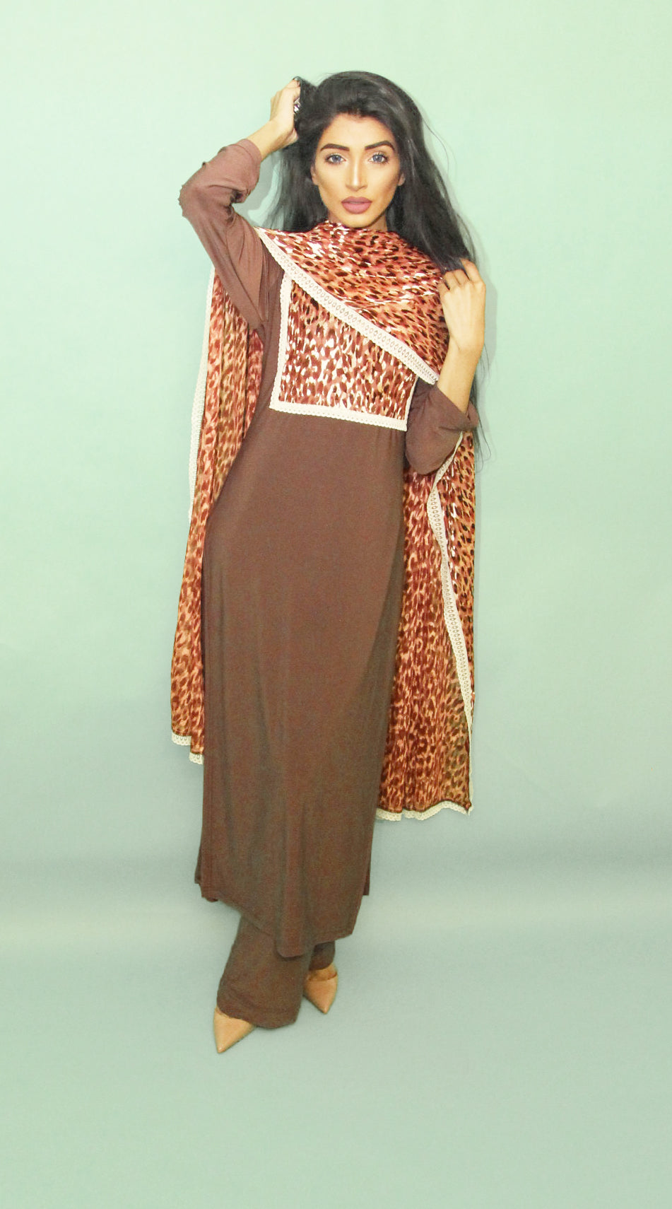 Chocolate brown/ leopard square neck chemise with pencil trousers and printed plutchy matching dupatta.