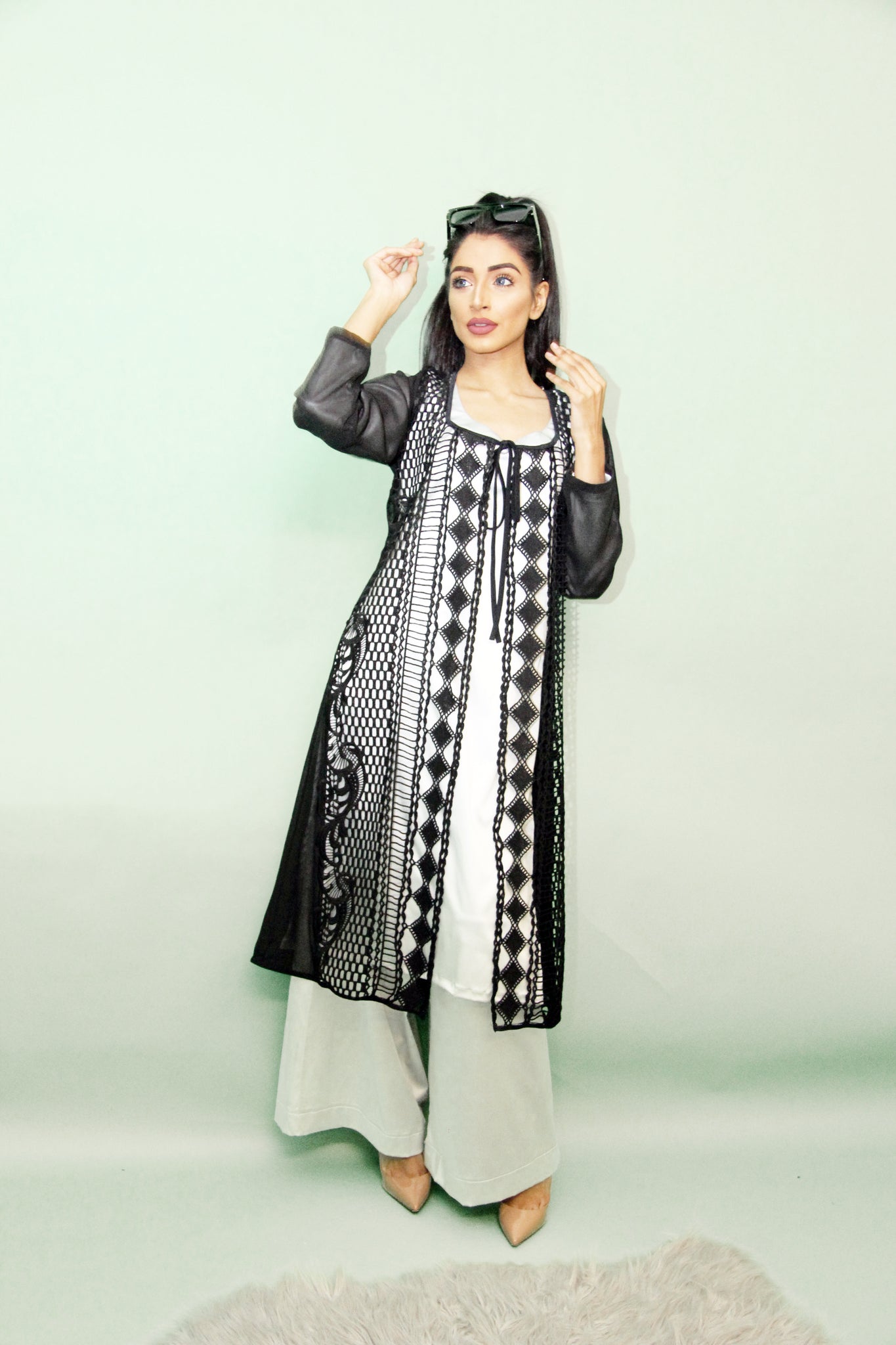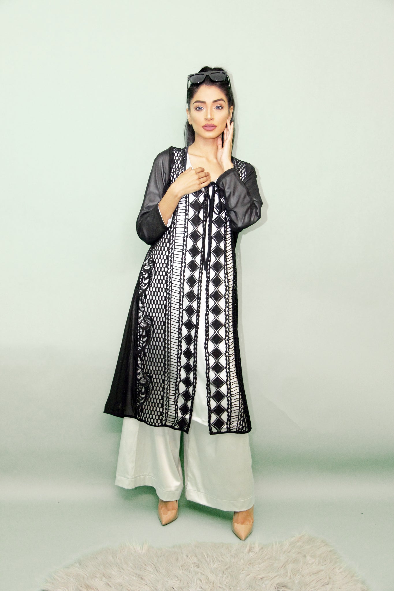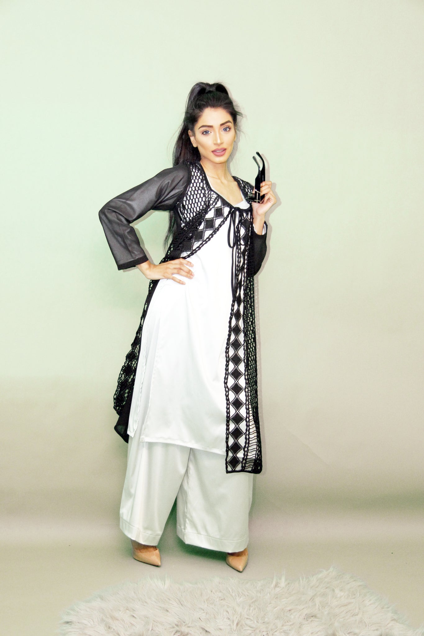 Silver stretch satin suit with loose trousers. Black lace over Jacket.